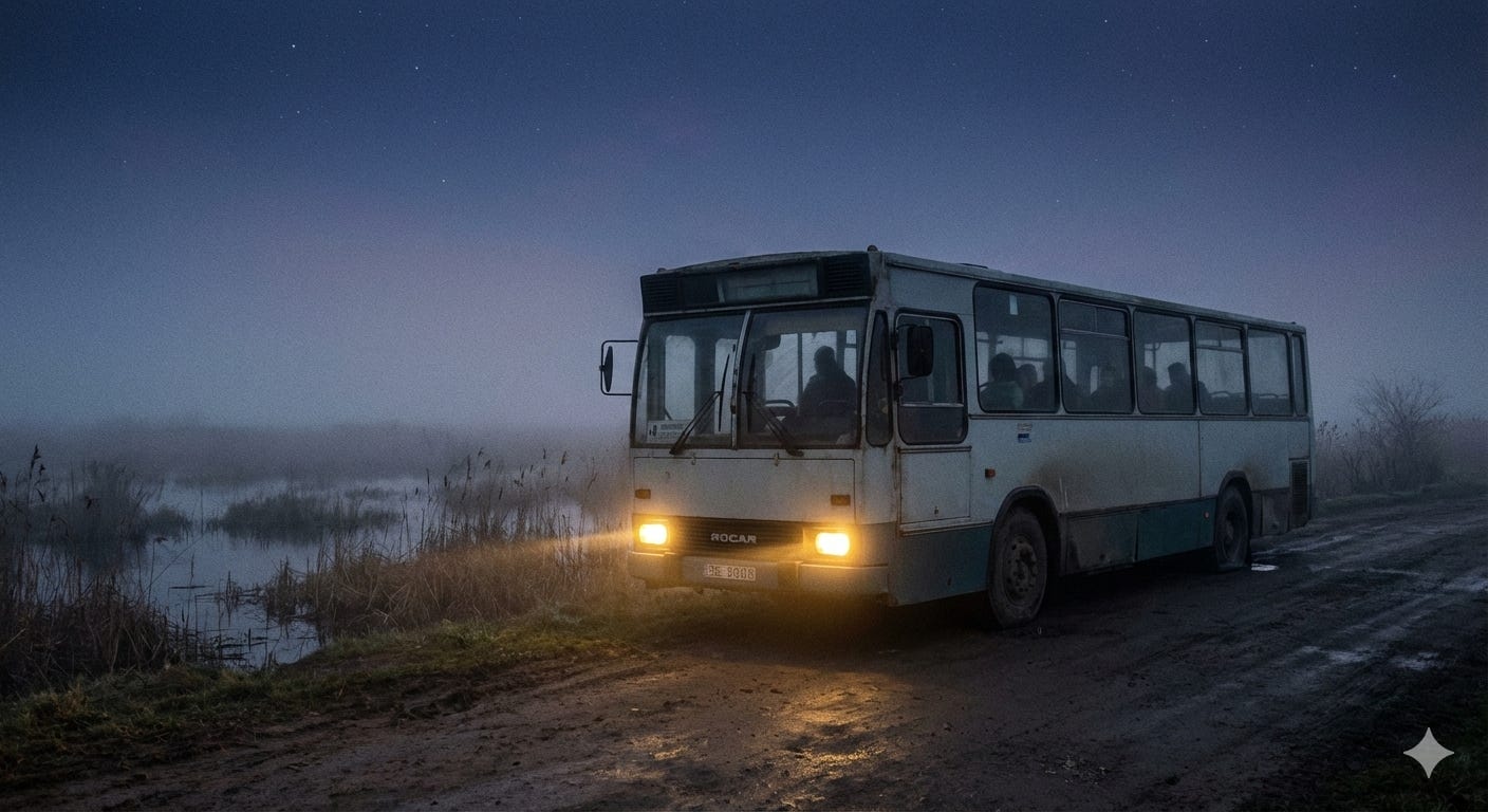 Bună dimineața! le spune șoferul, în pași repezi, încă de pe treptele blocului. Deschide ușa autobuzului și urcă, aprinzând becul de deasupra scaunului său. Motorul pornește iar în liniștea de până acum, sunetul metalic al diesel-ului se rostogolește peste ulițe și sperie iepurii din hrean.